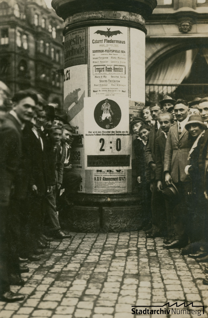 Bekanntgabe des Endspielergebnisses auf einer Litfaßsäule. Foto, 1924. (StadtAN A 35 Nr. 157-154)