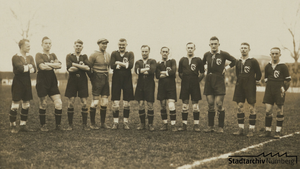Die Mannschaft des 1. FCN während der Herbstverbandspiele 1925, angetreten zum Spiel gegen 1860 München, das mit einer 1:3-Niederlage endete. Von links nach rechts: Toni Kugler, Georg Hochgesang, Luitpold Popp, Heiner Stuhlfauth, Carl Riegel, Hans Sutor, Georg Huber, Ludwig Wieder, Hans Kalb, Hans Schmidt, Wolfgang Strobel. Foto Kurt Grimm, 1926. (StadtAN A 35 Nr. 162)