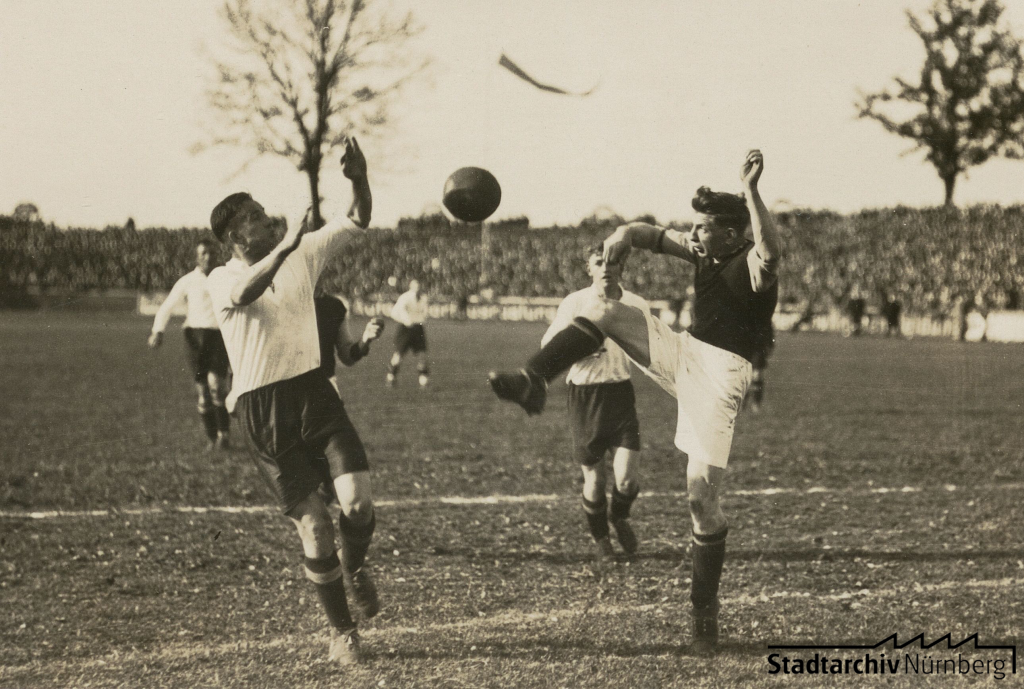 Spielszene aus dem „Zabo“ vom 4:2-Sieg der Nürnberger über den FC Burnley. Foto Kurt Grimm, 1927. (StadtAN A 35 Nr. 160/1)