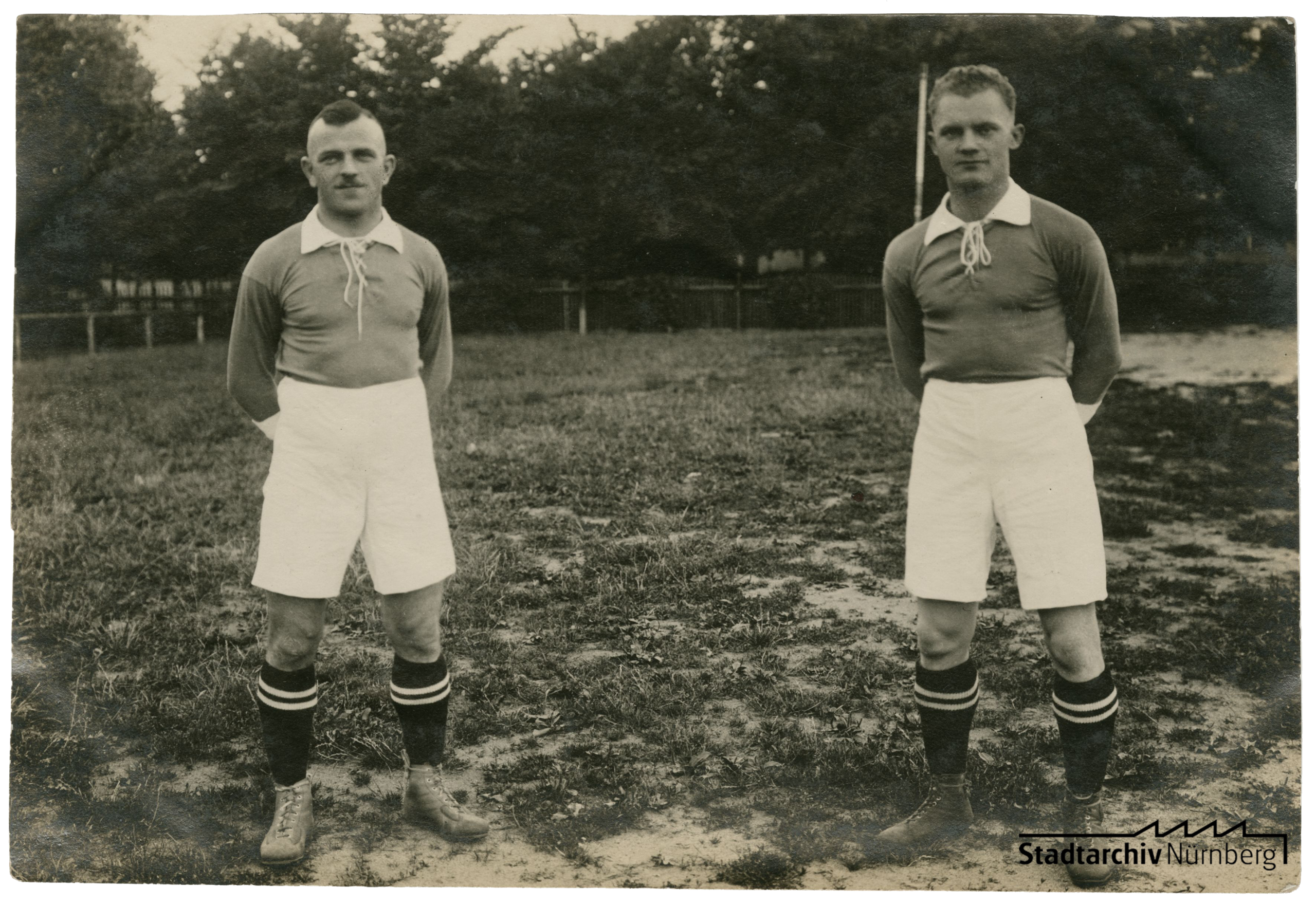 Heiner Träg (links) und Toni Kugler. Torgarant Träg galt als bester Linksaußen seiner Zeit, absolvierte 455 Spiele für den „Club“ und gewann fünf Meisterschaften. Foto Hans Schüßel, um 1925. (StadtAN A 35 Nr. 157-54)