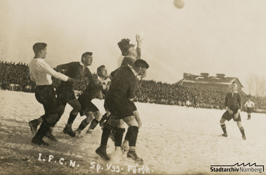 Auf schneebedecktem Rasen verlor der 1. FCN mit 3:2 beim Fürther Rivalen. Auch Torhüterlegende Heiner Stuhlfauth (in der Mitte mit seiner markanten Schiebermütze) konnte die Niederlage nicht verhindern. Foto Hans Schüßel, 1922. (StadtAN A 35 Nr. 157-33)
