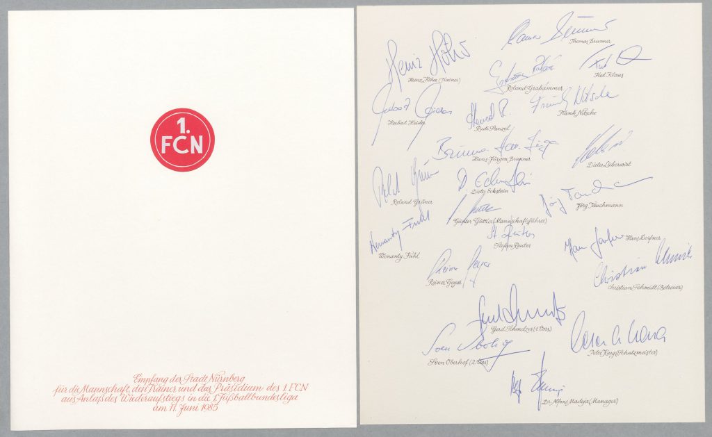Empfang der Stadt für den 1. FCN anlässlich dessen Wiederaufstiegs in die 1. Bundesliga am 11. Juni 1985 (Stadtarchiv Nürnberg C 85/V Nr. 1 / 61)
